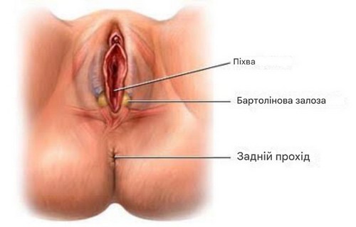 Бартолінова залоза розташована в задній частині товщі великих статевих губ, розміром до 1 см, її секрет забезпечує зволоження під час статевого контакту.Протоки бартолінових залоз мають довжину 1,5-2 см та відкриваються по задній поверхні малих статевих губ в присінок піхви.