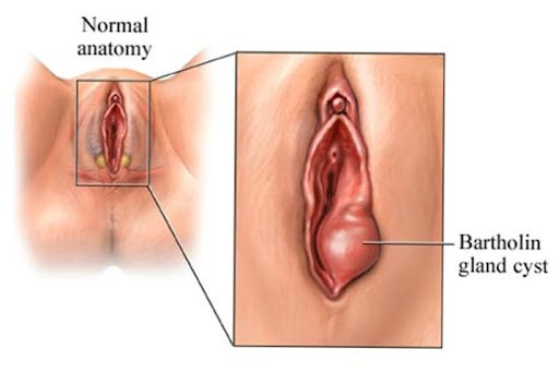 Якщо порушується відтік її слизистого секрету – формуються кісти бартолінової залози. Причинами утворення кіст може бути закриття протоки внаслідок хронічних запальних процесів в піхві, травми протоки під час пологів, формування рубця після епізіотомії. Інколи вміст кісти може інфікуватись, що приведе до нагноєння та формування абсцесу бартолінової залози.